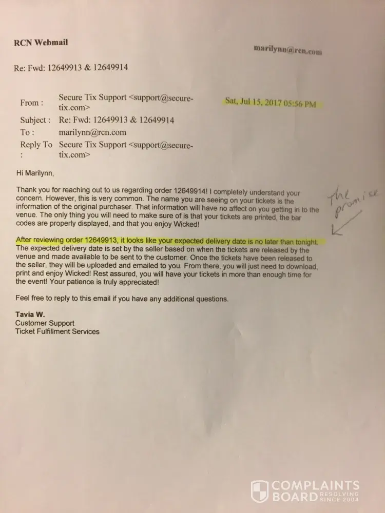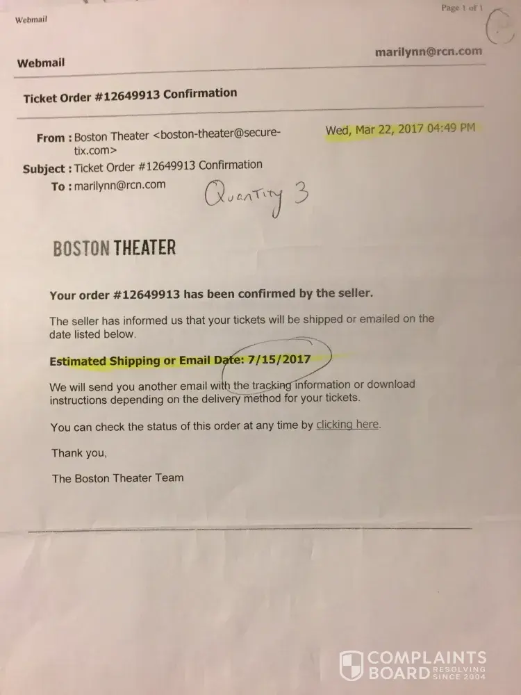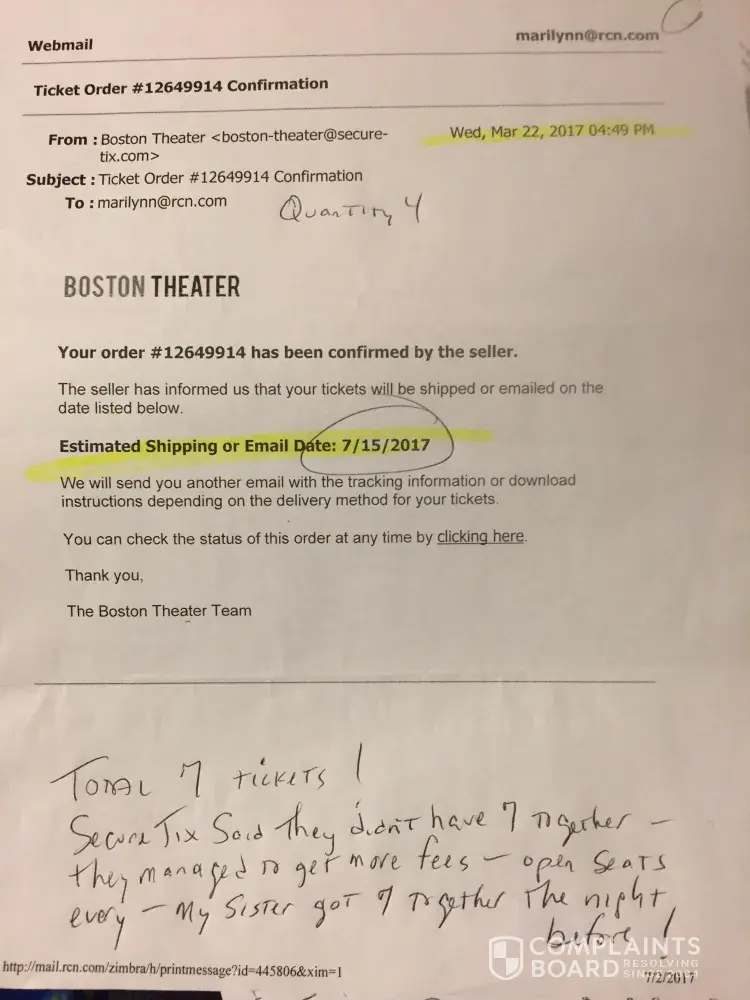 I bought 7 tickets to a show. Qty 3/qty 4 on March 22 2017 for the show Wicked: Boston opera House JULY 16th at 1pm (daytime show). 4 came right away (order12649914 for $476.15) 3 never came. From March to JULY I tried emailing (attaching a few Emails here)calling, chatting online. They promised and stated in writing I would have them by midnight July 15 2017. I was frantic at that time: still no tickets, blocked from phone.