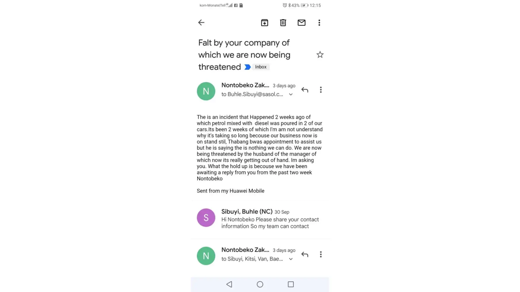 Petrol mixed with diesel was poured into two of our cars at the moment Sasol is giving a problem with fixing this mistake we are loosing business and to them they are taking it lite becouse their business is still operating and I'm just a small business owner from protea Glen. [protected].I will go to every public radio station until my voice is head. I'm now being threatened by the staff of Sasol for wanting what is due to me it's been 3 week