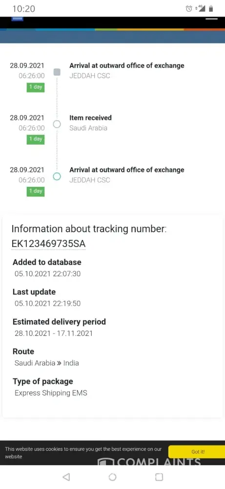Here is my tacking detail since 28/9/2021 it's shows Your shipment is on its way to Mumbai I called Saudi post customer service representative they said it's already reached India post office, when I checked Indian post office they says not yet received when I said it's been 8 days on its ways they replied back saying not at all possible 1 week in transit they asked me to check back Saudi post I went to central post office Jeddah they said already reached India but no reference at all please help me in this please let me know how can I get my courier asap.