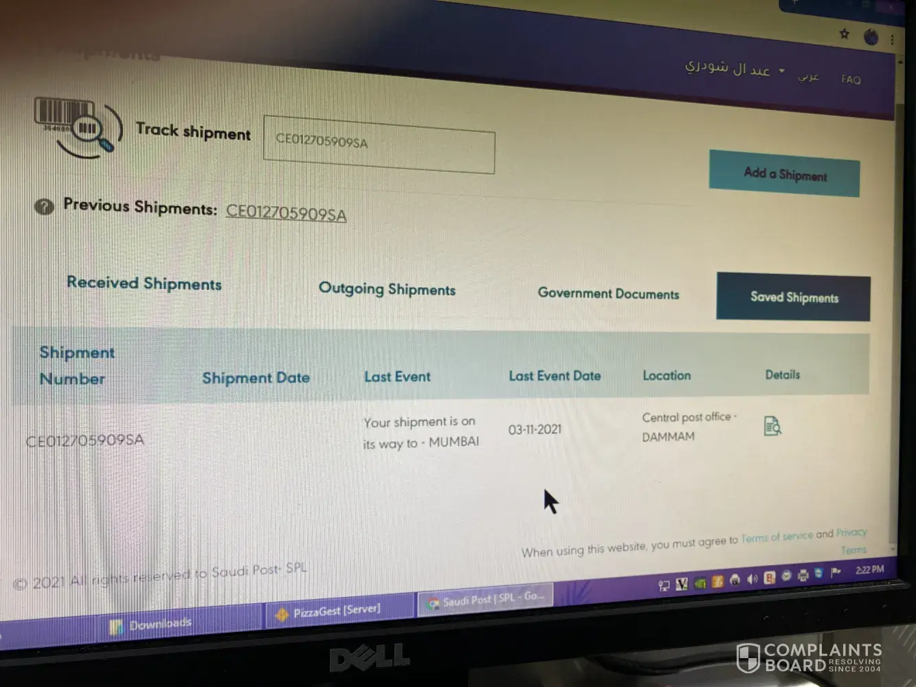 on 2nd november i send a shipment through saudi post, my tracking number is CE012705909SA its almost 24 days gone.but still my family didn't recieve the shipment .please check and send my parcel to india