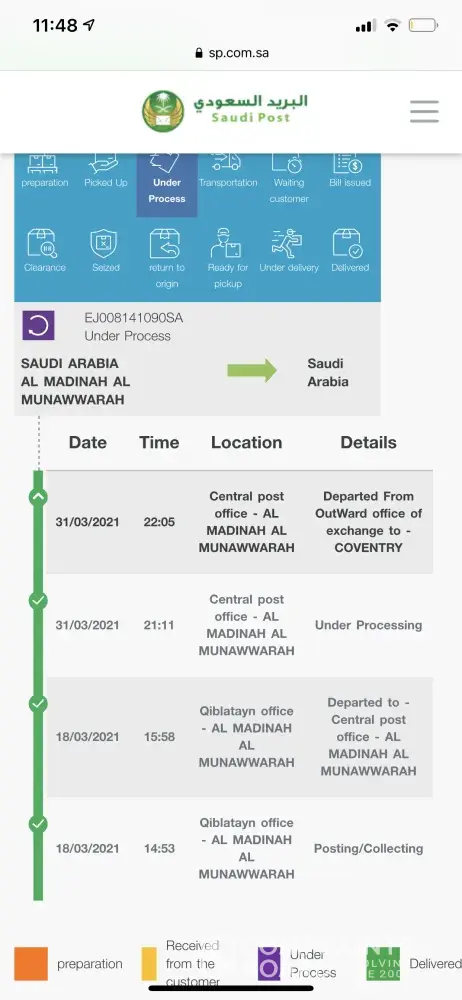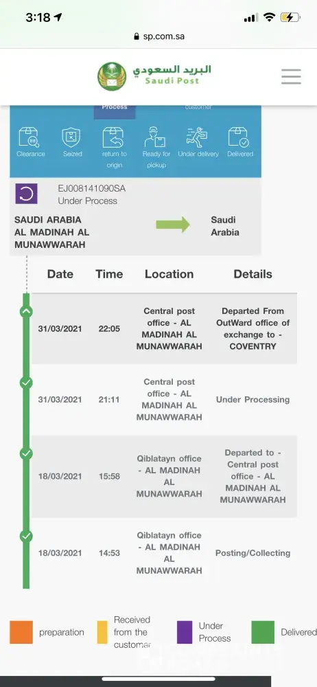 I have perched dates from A Suplier in Madina on 18th March and they handed over to Saudi post under the ref no. EJ008141090SA. Which was dew to deliver on 29th March but still the parcel status shows under proses in Madina central post office I have contact the supplier and he visited the post office last Thursday and being told the parcel will be delivered i four days mean Tuesday and today is Friday and parcel is still in Madina
