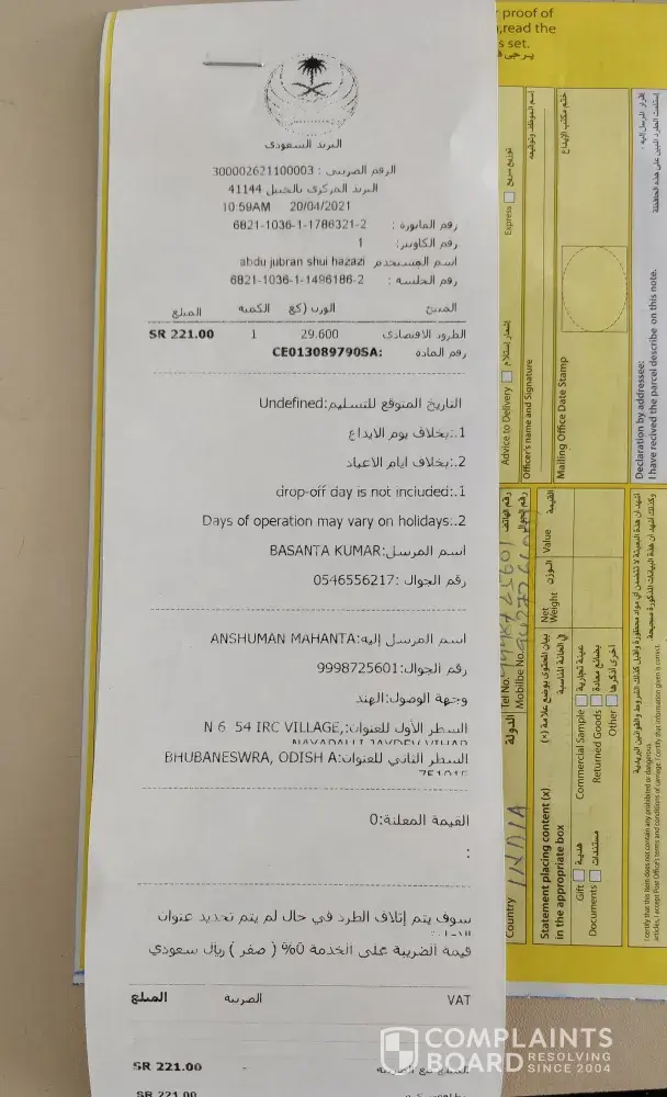 I have sent one parcel from Jubail to Bhubaneswar India on 19th April .Still status showing it is in Dammam shorting Center.Tracking number CE013089790SA.After calling so many times to customer service there is no movement in the parcel .Even in post office nobody listening the complain.Either send it to the destination or else back to me I will send through some other way.