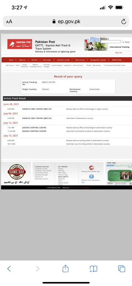 Tracking number of package from pakistan