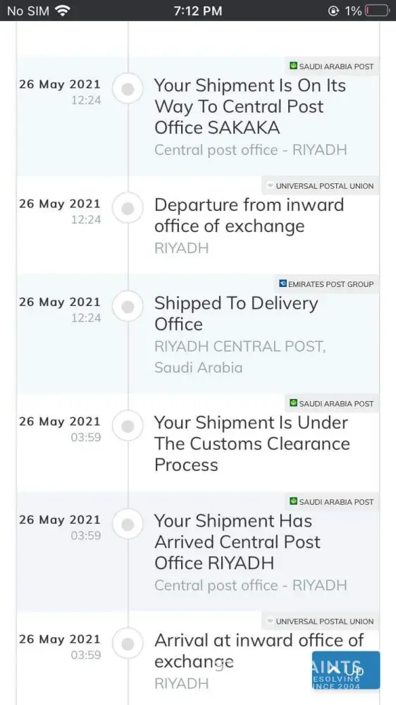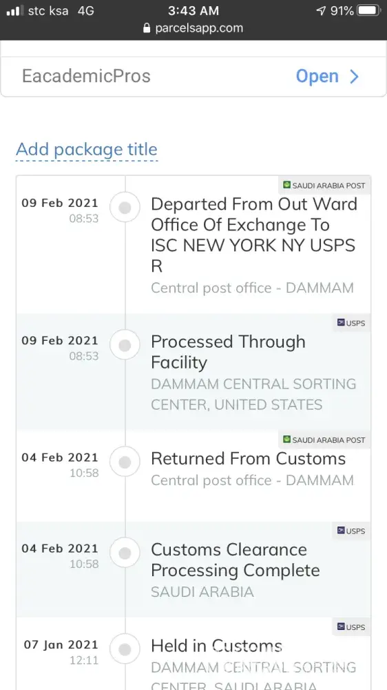 it was december 2020 when the package was sent from New york by Usps and received on January 2021 by Saudi Post.