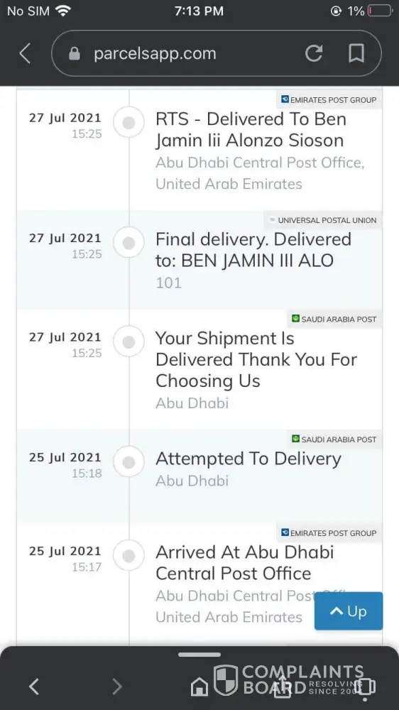 May 17, 2021, a cargo box was shipped for me via Emirates Post from Benjamin III Alonzo Sioson in United Arab Emirates. Tracking number CP102784096AE. The area of destination is Sakaka, Aljouf, Saudi Arabia. I was instructed that it will take more time than usual date of delivery due to restrictions of Covid 19. Months passed but still I did not receive a call from the post office about tge shipment. I was surprised that the cargo box was shipped back to UAE without any information if it reached my area. Now I will pay again for it's shipping fee to be delivered again to me. Kindly address the issue as it is really wasting time and money. Thank you!