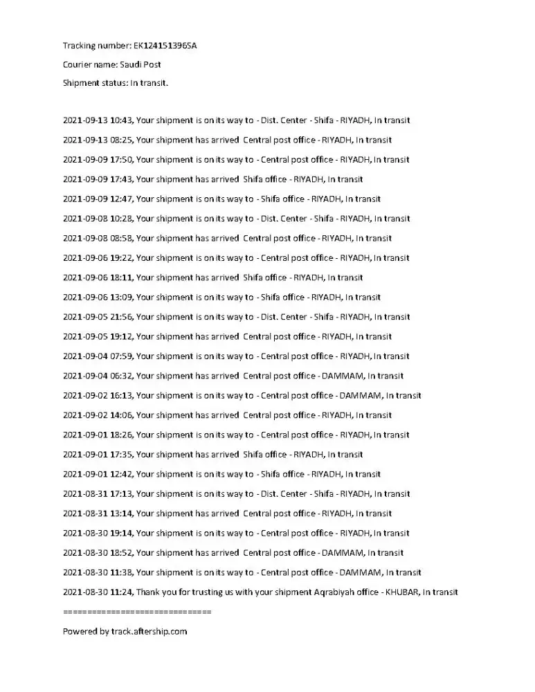I've been tracking for my shipment since 30 August 2021 from Dammam to Riyadh up to today 13 Saptember 2021, but until now the shipment history is just repeated again and again. I pay for express for the shipment and It's been delayed for more than 2 weeks. Some of my item inside getting damage. I also called the Customer Service but the they're just keep me waiting for nothing. I have some important item in shipment.