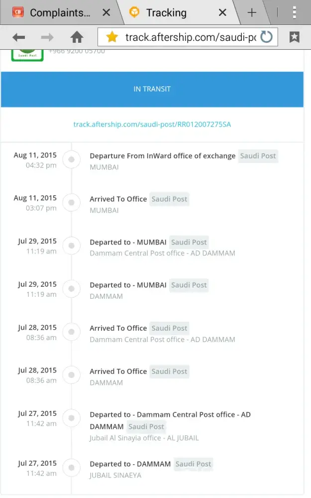 Hi everybody I was to get a document from saudi post from dammam in its tracking site it is showing from past 10 days the same status departed from the outward office of exchange to riyadh and in office section it is showing mumbai the tracking i. d is eh001743984sa somebody please help as that document is very importatnt for me how can I get from what I came to know from internet it is ready for going through the scanning in the inbound customs department and then it shud go through inward exchange from where it will go to gpo for distribution. but all this shud happen before 1 week i. e the document should be in outward exchange department for only 1 week but why mine is taking more than 1 week please some body help me as mine is a serious case.