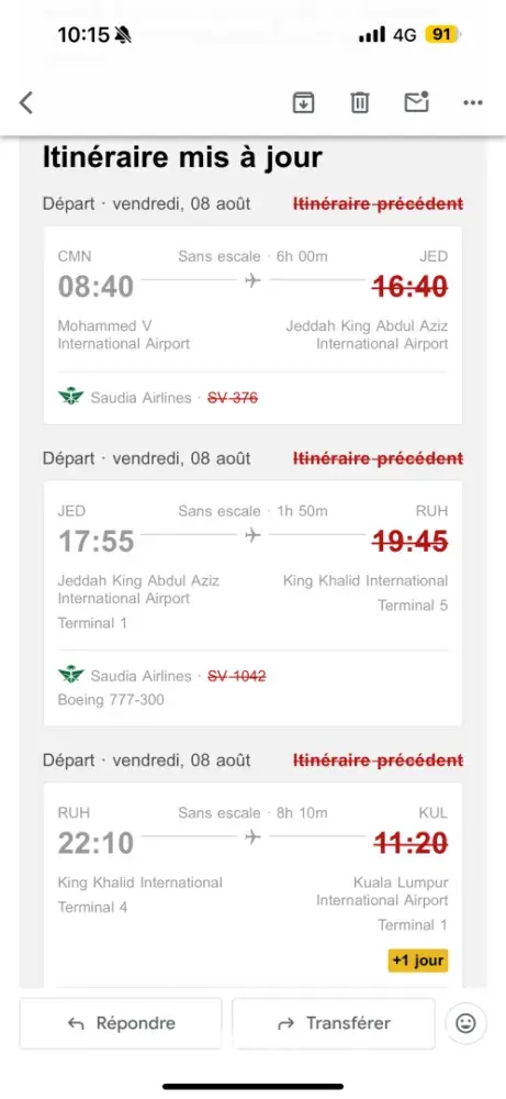 Dear Saudia Customer Service, I hope this message finds you well. I am writing to formally express my concern regarding a significant delay on my recent flight with Saudia. My itinerary was as follows: - Flight: SV376 – Casablanca (CMN) to Jeddah (JED) – Date: 08/08/2025 - Final destination: Kuala Lumpur (KUL), via Riyadh (RUH) The initial flight...