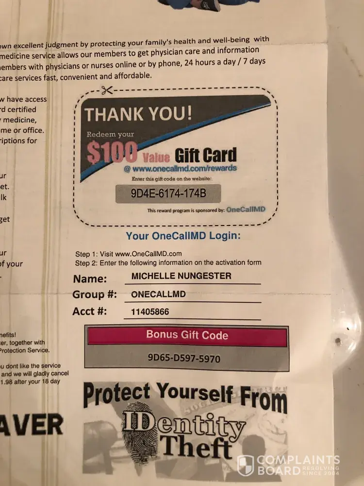 False information just to get your bank account information I received a call from one call MD stating I was going to get a free visa gift card that I can use nationwide in seven days but I get a veteran said with the paper gift card that I only can use on their site and it's a partial gift card where you buy something and you can use some of the money...