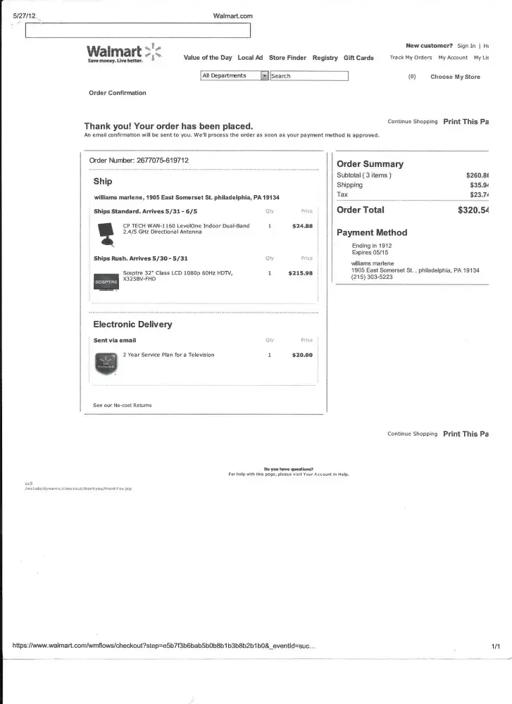 Hi, my name is marlene williams 1905 east somerset street, philadelphia, pa, 19134. I purchase a sceptre 32" class lcd 1080p 60hz hdtv, x325bv-fhd flat screen tv during the month of may in 2012. it is now april 2015. on the morning of april 16, 2015. I awoke and pushed my tv remote power button on. to my surprise my tv was black. the only thing that came on was the blue indicator light on the tv. the power indicator light now stays on and will not turn off, besides not seeing a picture blew my mind there was no misuse of my tv, only normall use since the day I purchased it. I have no tv to watch for 8 days now. today is april 23, 2015. I am truly upset about the situation. so I decided to do some research on this sceptre tv. I found that this particular model have had complaints of this same problem. I do have proof of purchase and photos of the tv. I would like to be reinbursed for my tv so I can buy a new one if possible. please take this complaint into consideration. I pray that you find favor in your heart to reinburse me for my purchase. thank you for taking the time out to read this. it is much appreciated. my phone number is [protected]. god bless!