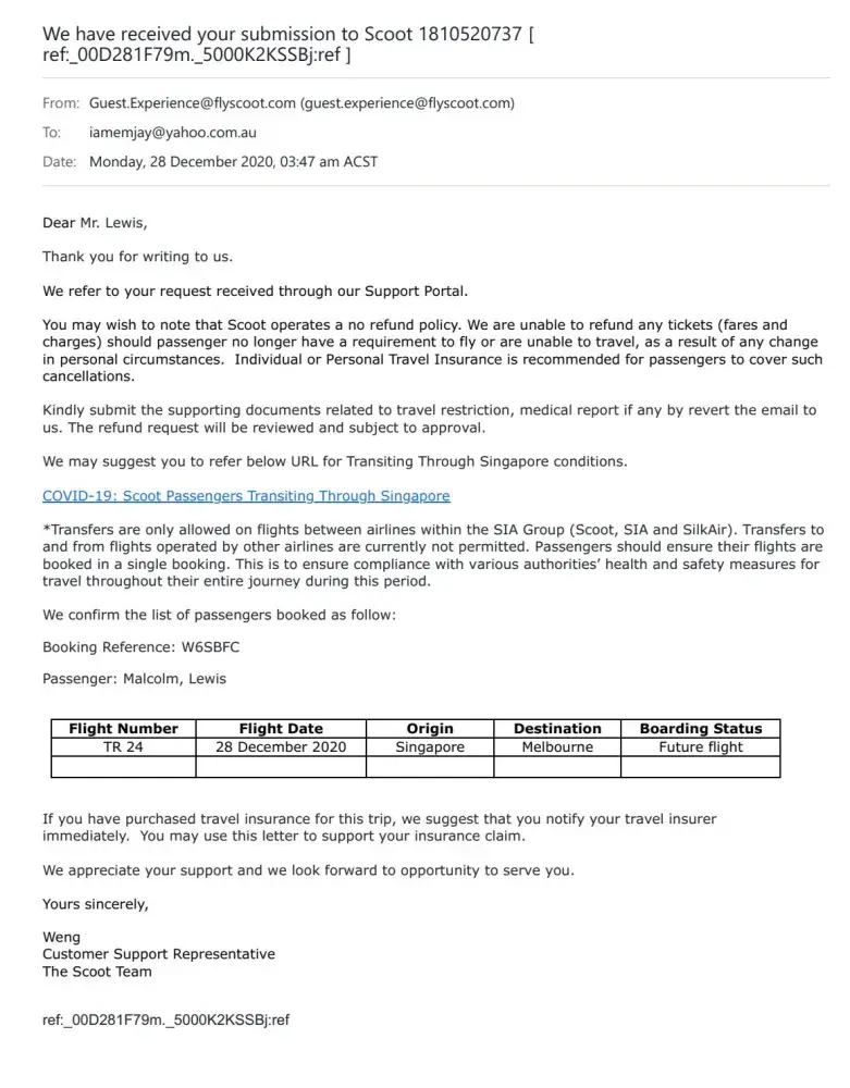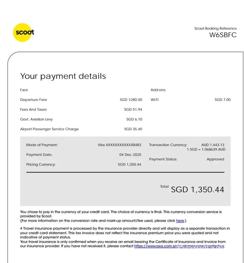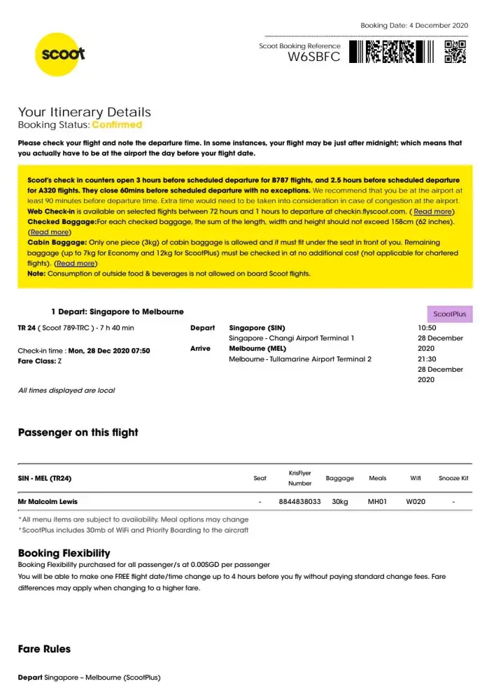 I booked a flight from Singapore to Melbourne on December 29, 2000 (Booking W6SBFC). For this I was charged $AU1350 (In "normal" times Scoot's charge for this route is AU$199). Despite the fact that, taking advantage of the lack of competition through border closures, the fare was exorbitant and they still maintained their budget airline, no fare refund policy. (By contrast, their parent company Singapore Airlines charged only AU$895 for the London to Singapore leg, with full cabin service and guaranteed refundability or changeability of dates.)