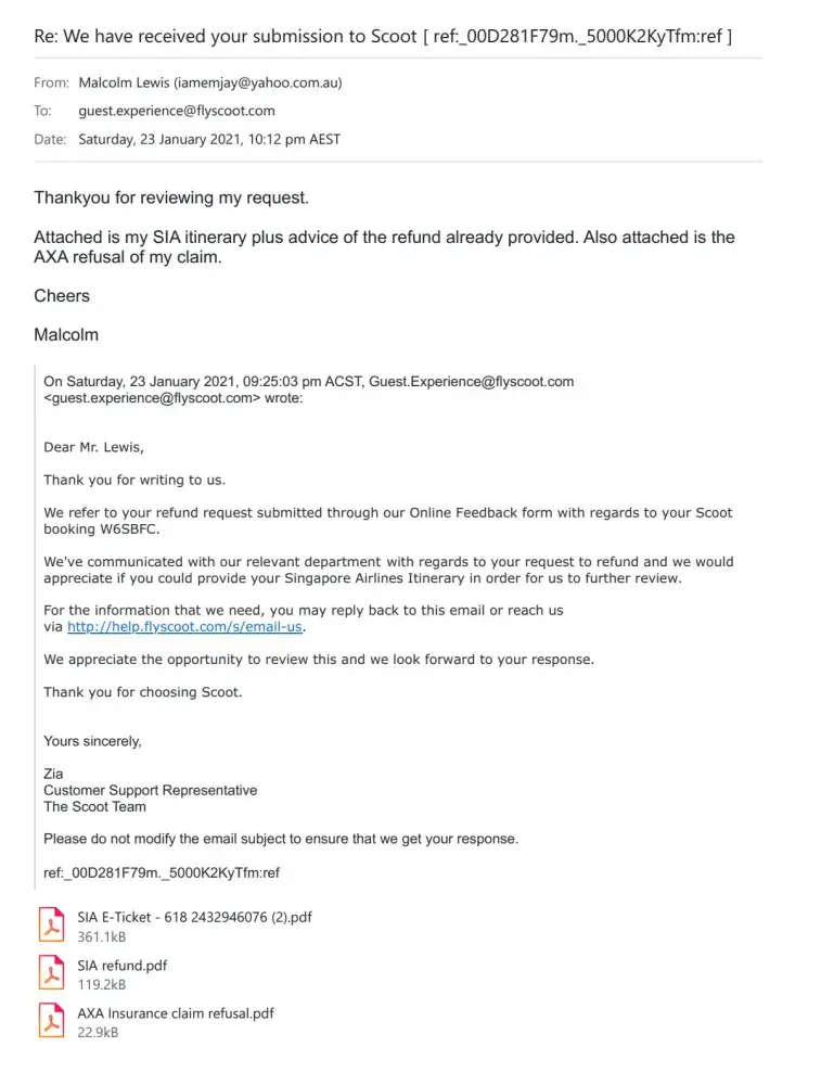 I started communicating with Scoot Online and also SIA at the beginning of the Year 2022, details and references are given below: