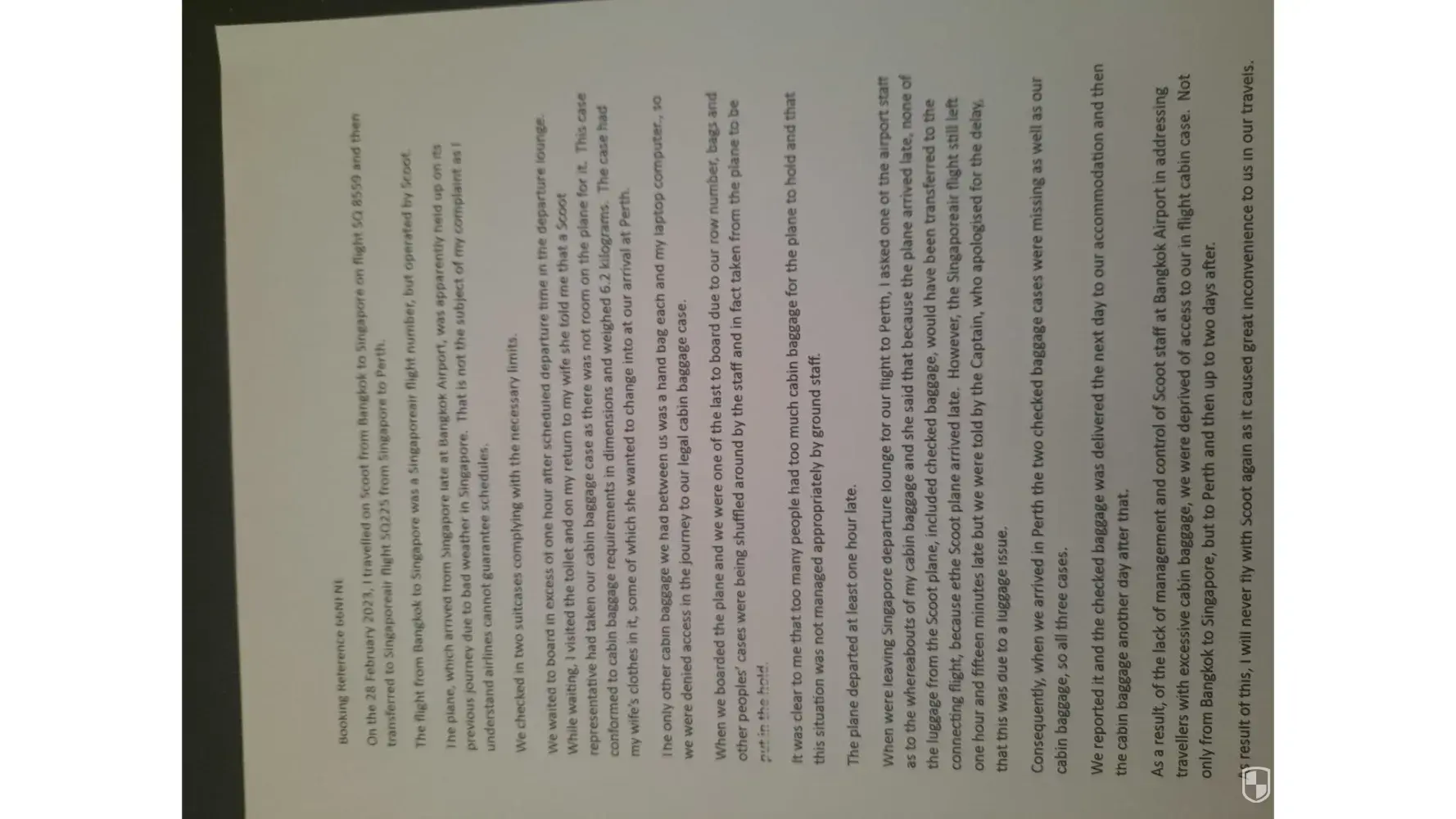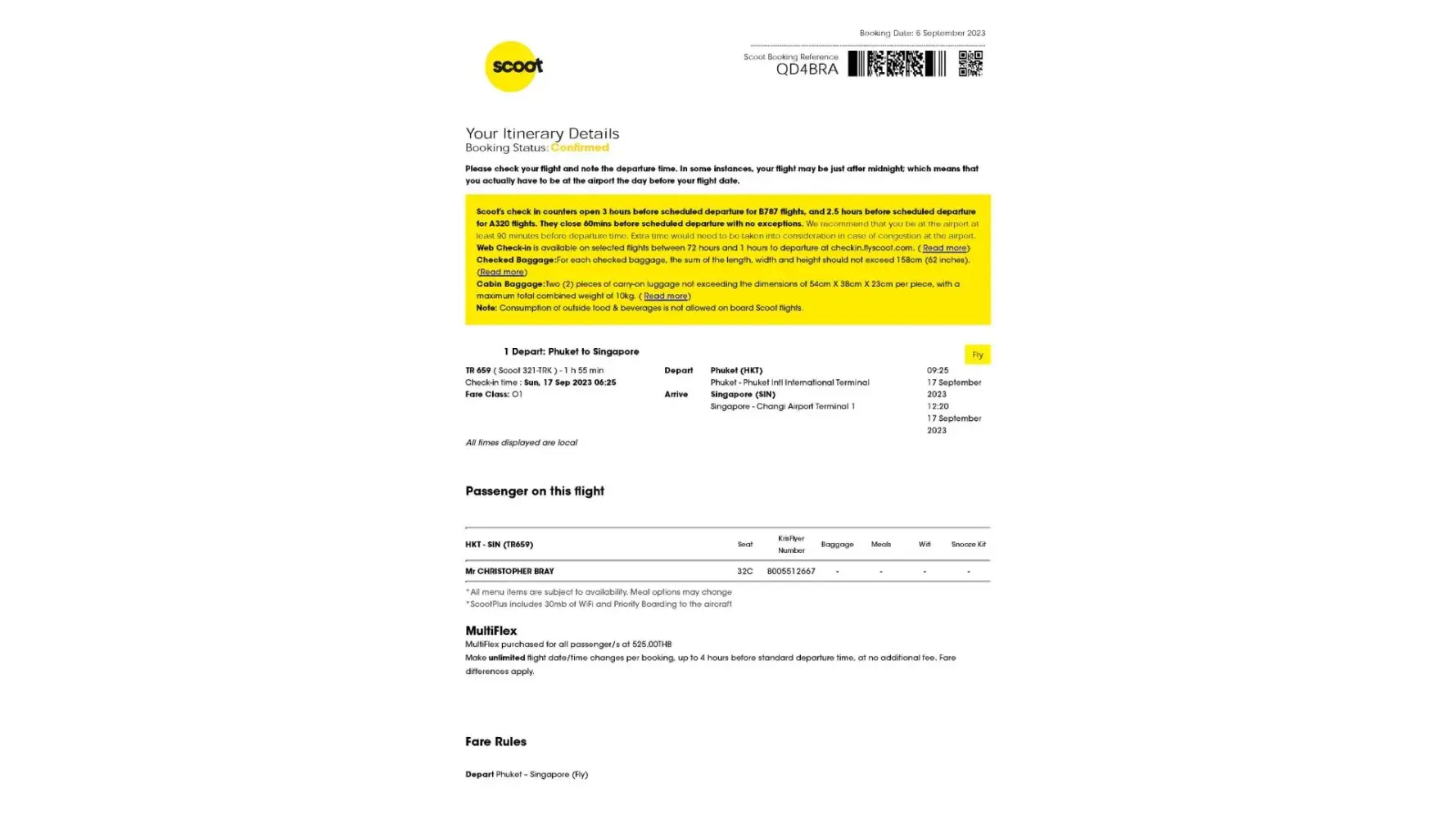 On the 28 February 2023, I travelled on Scoot from Bangkok to Singapore on flight SQ 8559 and then transferred to Singaporeair flight SQ225 from Singapore to Perth.