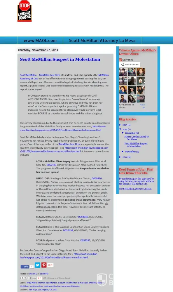 Although San Diego attorney Scott McMillan has spent a lot of time attempting to bury his past by using new domain names and posting his own reviews, it is critical we keep these posts going to prevent harm to children and keeping the public informed about the potential threat to kids based upon a documented past as seen in the attached report.