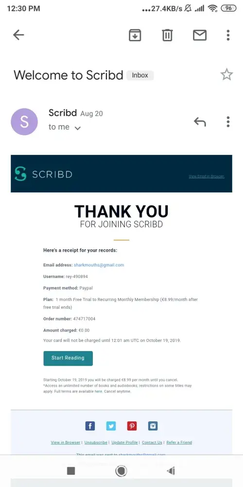 I couldn't even find a registered Scribd account under my email, nothing from them till got mail from Paypal, noticing me that Scribd charged me. After that, i see a lot of people were scammed by this website