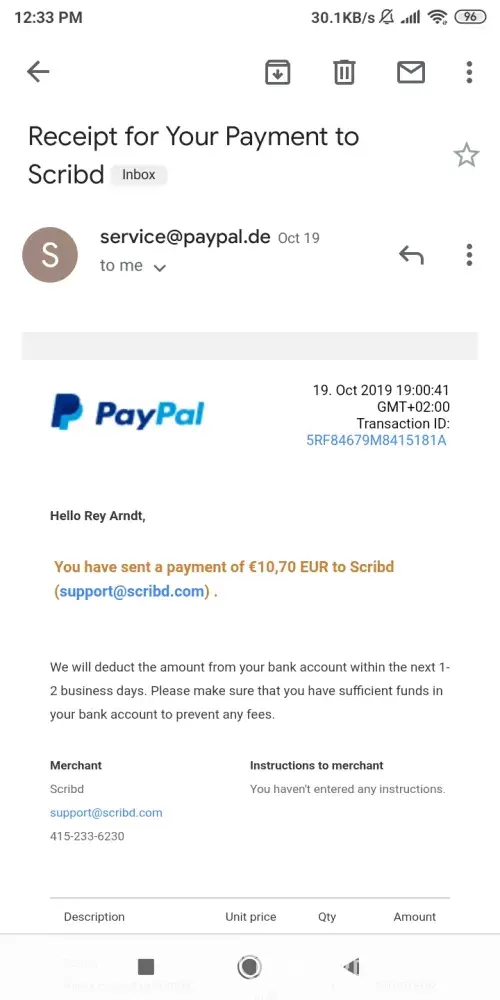 I just wanted to understand why I have $8.99 being withdrawn from my bank account every month since October 2018 to the benefit of Scribd Inc.