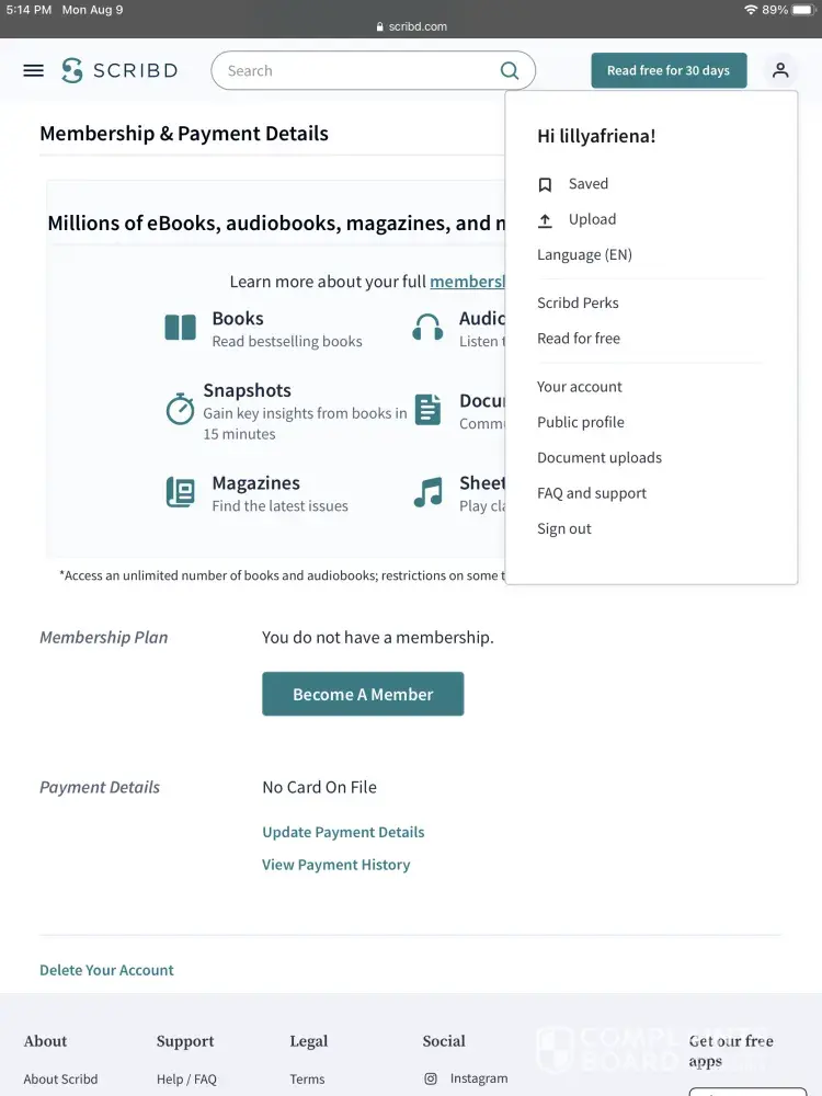 I would like to cancel it immediately, but my account information in Scribd says "You do not have a membership" and the payment details say "No Card on file".