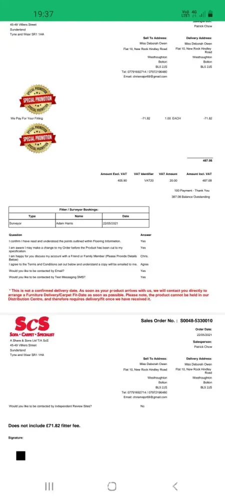 I contacted the carpet manager Aleyah after their visit and she stated that the carpet fitters can charge any extra for the job they do, for things such as glue, which again was not used. She stated she would call the fitters regarding my missing cleaning kit on Monday 12th July, I am still awaiting to hear anything back regarding this. I was told as a ‘good will' gesture I would receive a refund for the difference in the invoice fitters fee I was told about and what they actually charged me. There is no good will here, the fitters did not use the glue which again I was charged for.