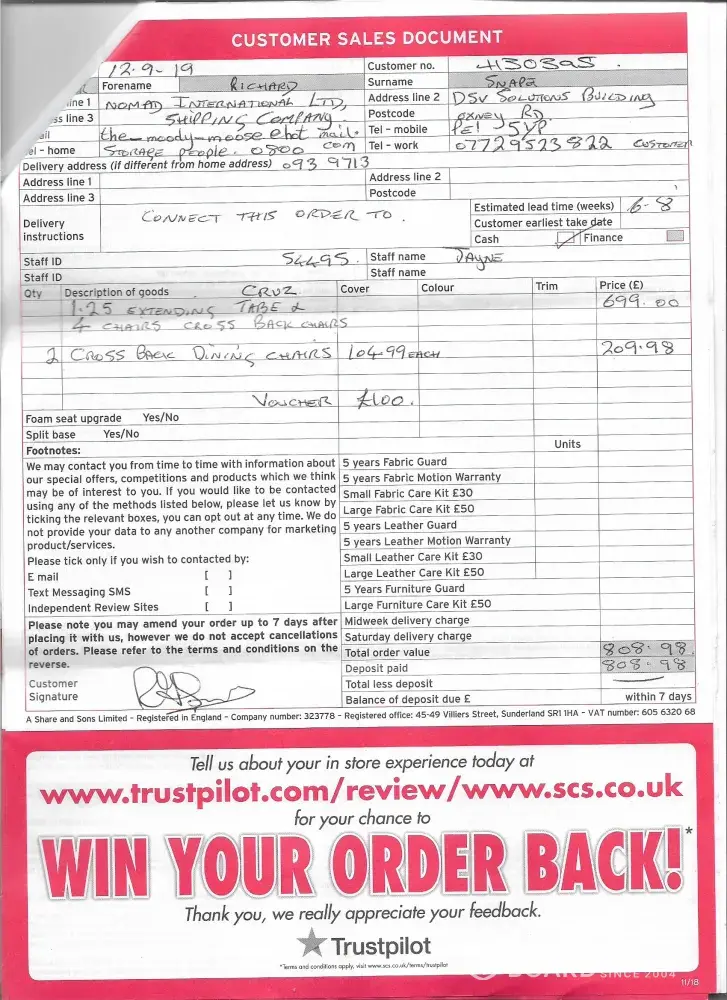 In September 2019 I bought among other things six cross backed dining chairs from ScS at Lincoln. They were to be delivered to Nomad International in Peterborough for delivery to my house in Crete.