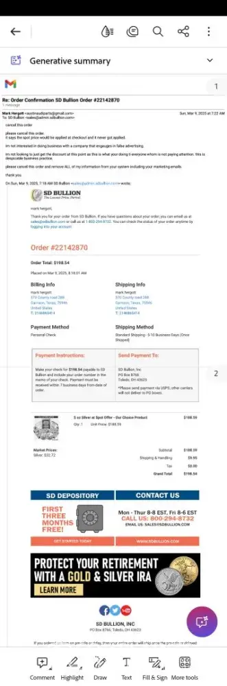 Not able to cancel any order placed with SD Bullion?! Purchase Date : Feb. 2nd Problem Date : Feb. 3rd. Order number : *** Sales Rep :*** I received this email stating that any cancellation will only be allowed under extraordinary circumstances and there is a $35 cancellation fee. I never saw any terms as such being prompted to me during the checkout process and therefore I am not aware of such a term of use. If I knew this, I would never place any order from such a business that does not allow cancel order or return order. I don't think it is best business practice to disallow your shoppers to cancel an order. Especially the order hasn't been processed or received yet. I literally canceled it within half an hour after I placed the order. *** Per our Terms of Use, any cancellation request must be filed via telephone during normal business hours. Our customer service team will evaluate any request to cancel an order on a case-by-case basis. Only under extraordinary circumstances will a cancellation be approved. As a reminder, cancellation fees are due at the time of cancellation. Cancellation fees are calculated as 5% of the order total or $35, whichever is greater, plus any applicable market loss. Our bullion team can be reached at [protected]. We are available from 8 a.m.-6 p.m. est Monday through Thursday and from 8 a.m.-5 p.m. est on Friday. Sincerely