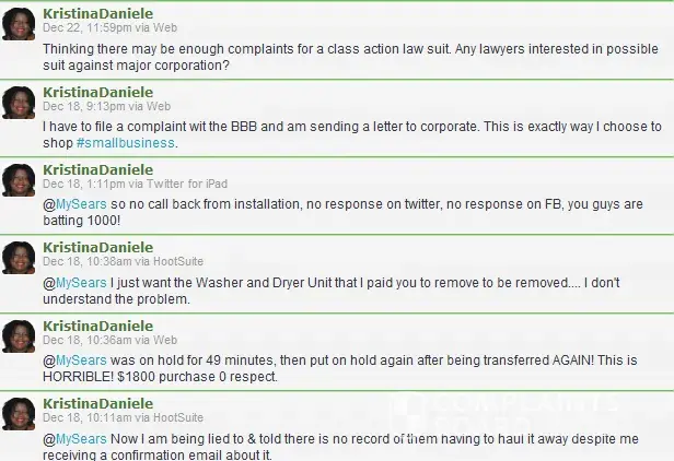 And for $1800 we had nothing but stress and headache. As you can imagine we are extremely angry and disappointed. We e will NEVER by merchandise from Sears again. And I am not the only person having these problems with sears. Their Facebook page is filled with similar complaints and stories.
