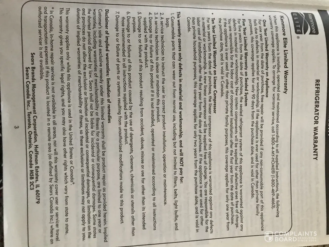 Users Care Manual, Page 3, Kenmore Elite 10 Year Limited Warranty on Linear Compressor states "is warranted against any defects in material or workmanship. Case 6953728/Denied without asking for info/UNACCEPTABLE! Sears Voice Mail Prompts are not Customer Friendly in the Complaint Arena