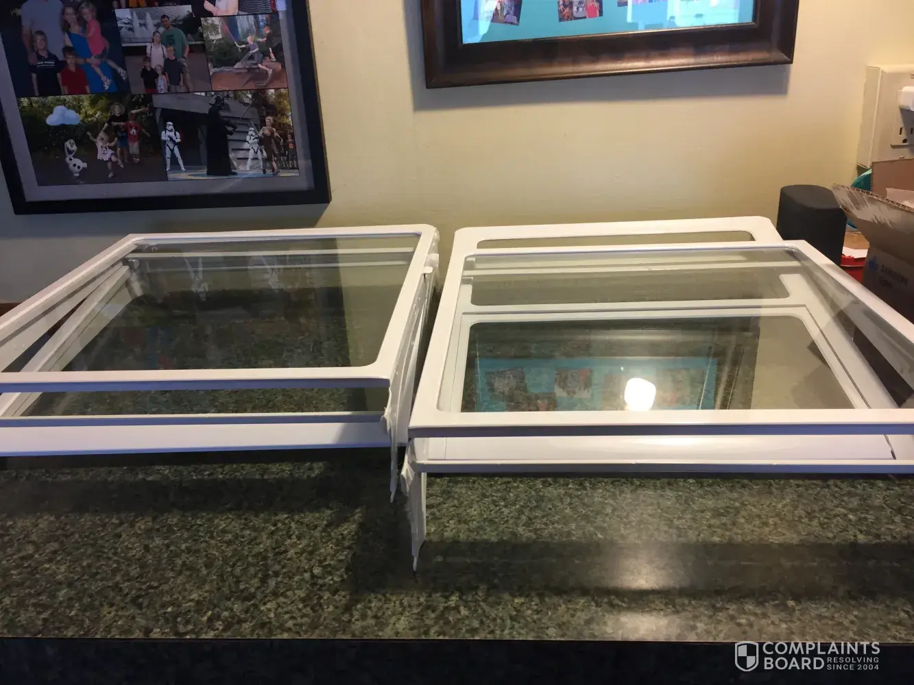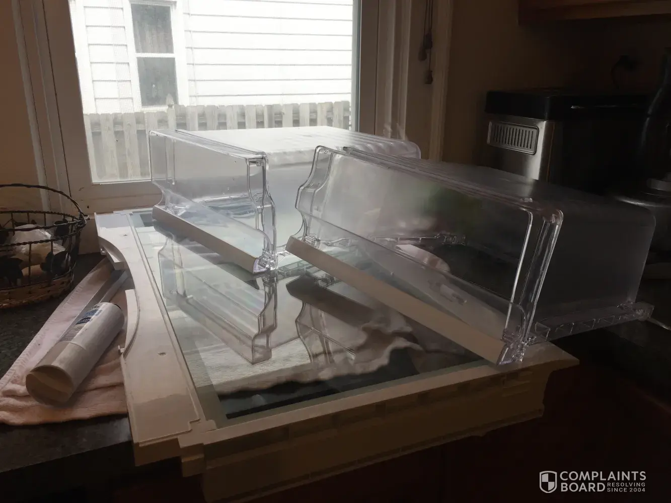 The technician left, with all of the refrigerator shelving and other parts on the kitchen counter
