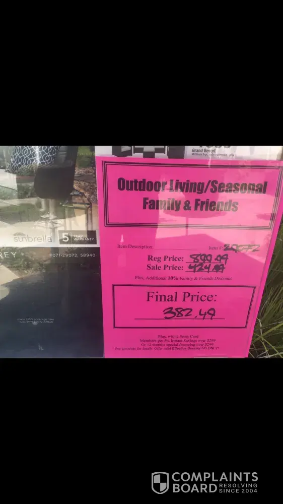 Tried to buy a 3 piece patio set they had on sale, had a sign naked with sale price. The supervisor went get the store manager they refused to sell us the set at the sale price. The manger obviously does not know the federal laws the price was clearly marked next to it was a picture of the three piece set which stated two chairs and fire pit table with item number underneath it which match the item number on the sale price there was no description written on the sale price. Filing complain against Sears.