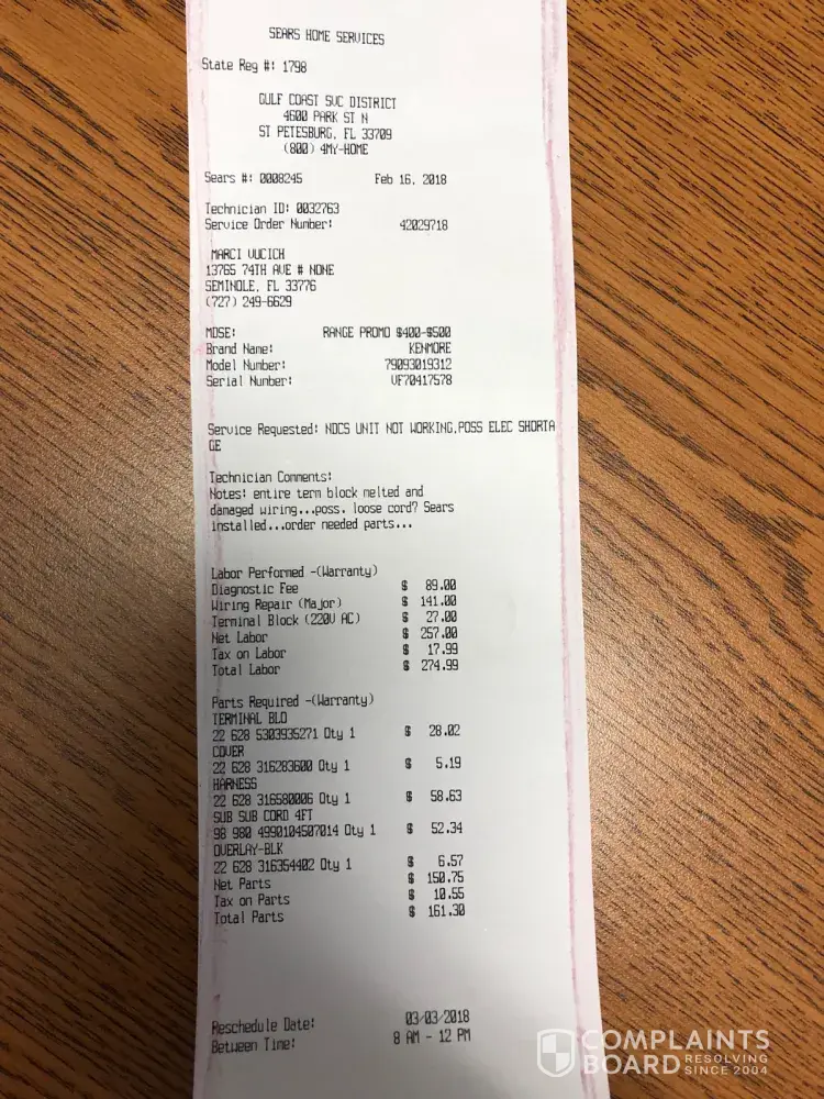 I called Sears the next day (2-15-18) to seek direction on the path to get a quick solution for a replacement and was told that a repair technician had to come out to confirm the issue first. This appointment was held on 2-16-18 and the technician confirmed the entire "guts" (wire harness, cable, control panel, etc.) was damaged and full replacement of parts was required. He further asked if Sears installed this electric range and I confirmed yes showing him the paperwork. His conclusion was the installer did not properly tighten down the neutral wires thus overtime caused the arcing that melted the cable to range and subsequent wiring harness and control panel to the oven. The total parts and labor far exceeds the value ($200 parts, $260 labor) of the new range I paid plus I'm very distrustful of the range fearing I'm putting my family and house at harms way of future incidents. The lead time of parts and availability of a technician out to 3/3/18 - total of 17 days! This was unacceptance and a complete inconvenience. I requested a new range and he indicated I need to work with the Sears Countryside store where I purchased it for a total replacement as he was not authorized. He fully understood my situation and in the spirit of customer service he went ahead and placed on order my parts while I worked with the local store for a complete replacement with a way shorter lead time and ease of mind.