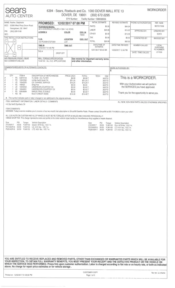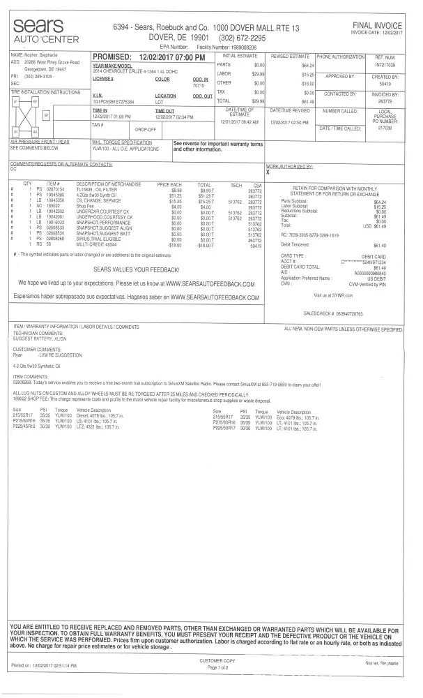 My name is Mike Morris and I have been using Sears for around 10+/- years now to do most of my vehicle servicing. In large part because of the coupons I get. I can't do the oil change on my own as cheap as some of the coupons. For the most part, I was content with the service. However, the last couple times I went (with an appointment), I have been nearly 2 hours waiting. This started when the Sears Auto Center in Seaford, Delaware closed and I was left with the Dover Delaware location. So on this visit, I asked my fiancé to take our car for the servicing as I am not able to walk around for as long right now with a temporary physical condition. I have had the car there before, so we know they should know what is needed. She took the coupon for a $15.99 service for a standard oil change (the same I have done with both of my vehicles). We just pay the difference for the different oils each vehicle has needed (5W-20 in truck and semi synthetic in car0. The value is still good, and they let us know that it will be slightly more up front. So can somebody at your offices explain how she ended up paying $61.49 for our last oil change? I gave her money to cover it, but it didn't cover that cost, so she had to use her card which almost put her over her limit. That was not the only problem as she had to wait longer because they ran out of oil, even though we were scheduled in advance with the type of car. There was no reason to run out of oil in the early afternoon. They charged her for synthetic oil, but the car has always been semi-synthetic. She didn't request different oil, but just to do what the car called for and nothing special. We feel like she was taken advantage of for being a woman who just didn't know the things I would know. We have had this done before for way less and feel she is owed some money back for this. I have attached the paperwork as proof of coupon and what was charged. If I don't get some answers from this, I will keep going higher through Sears until I do. We are very frustrated with how this was handled. The dealer will use the correct oil and rotate tires for around $20 less, and they are only 3 miles from our home, and not nearly 35 miles like Dover. After this experience, depending on how the complaint is handled will determine if we stop going there completely along with family and friends that we convinced to go as well. My email is the best way to contact me as I am in and out of meetings all day with my company. The email is [protected]@comcast.net (my company email won't come through from there). My mailing address is: