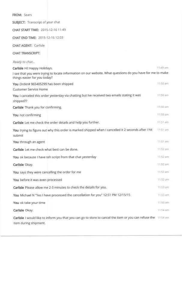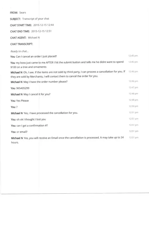 I placed an order for a pre-lit tree and ornaments for the office per my boss and right when I clicked the submit button Boss tells me he doesn't want to pay that price for those items so I immediately clicked on Customer Service Chat. I gave the order # and explained my dilemma and was told he cancelled the order and I would receive an email within 24...