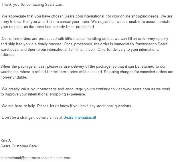 I am done with Sears customer service. I am done with Sears. I am going to have to look into an alternate method of getting a refund for this product.