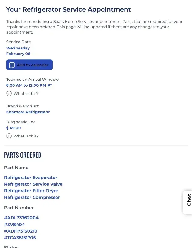 My refrigerator is still under warranty. I've been waiting for weeks for parts the repairman (from sears home services) ordered. Today I received an automated phone call from Sears Home Services telling me I have received the parts and should schedule a repair appointment.