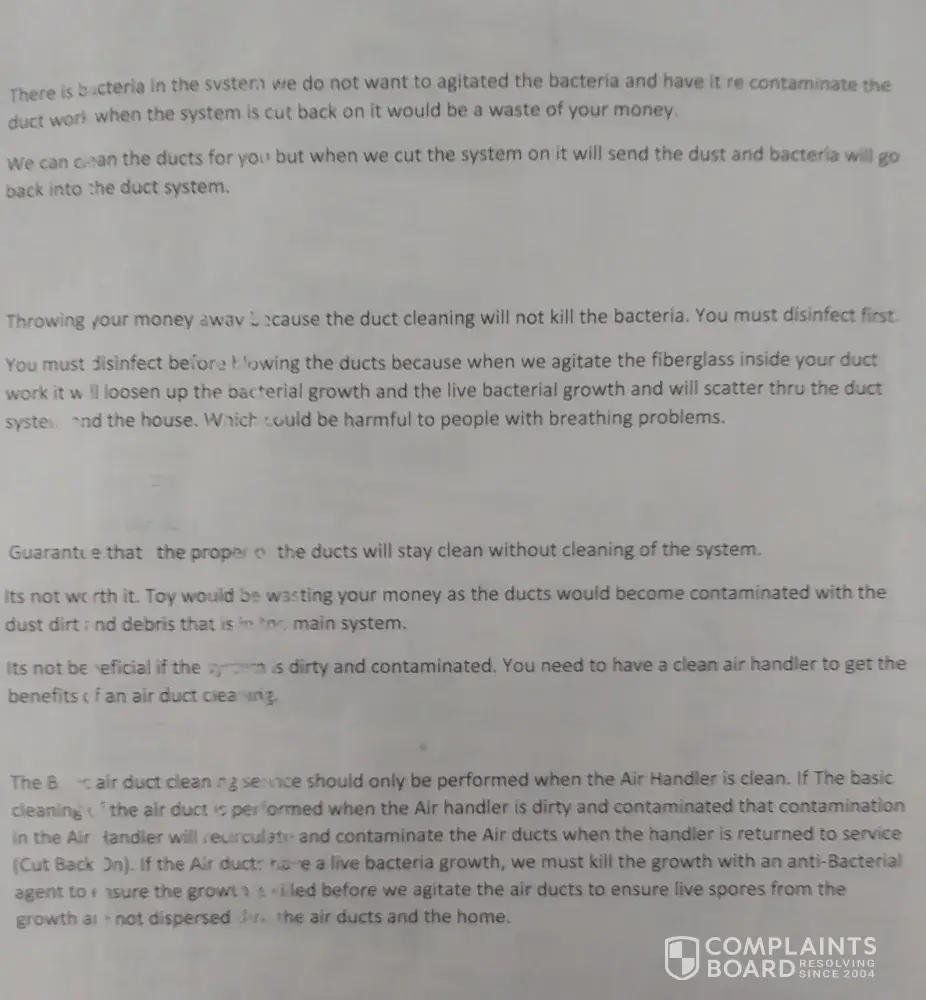 I paid more than $2000 have have the air duct cleaning and service three furnaces. When they left, about half of the ducts were not cleaned and none of the furnaces were working. (The technician said that they all worked fine.) One of them was not even connected to the gas line; the other had a short circuit; and the third one had a problem with the thermostat (and he left the pilot off). He also sold me a UV light for $300 that when checked later, was not working. Finally, I had to chase them around the house so they did not scratch the wall with the hoses and equipment.
