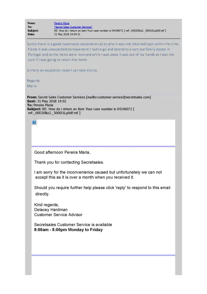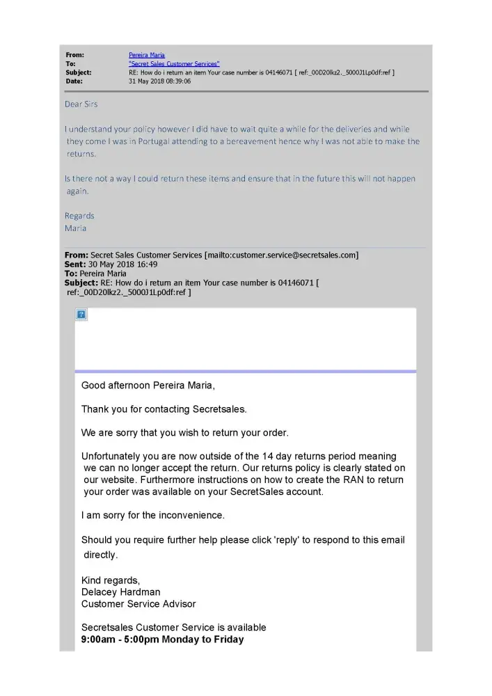 On 12/06/2018 The customer service team secret sales forwarded the email onto brandlogic, who i emailed on the 13/06/18 asking for a quick response.