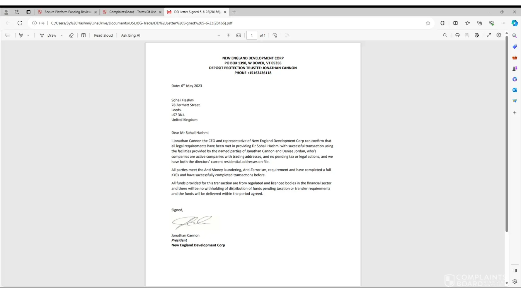 They give you written guarantees of performance signed by All three parties Secure Platform Funding Bruce Green Jordan Denise & Jonathan Cannon that they will deliver from our investment 40,000,000. When they don't pay on time & per their promises, they make excuses. Can we have another three months, we haven't been able to start the transaction yet. Prior to this they say yes to everything. They have a disparagement agreement which means you can say nothing derogatory about them, or they have a reason not to pay