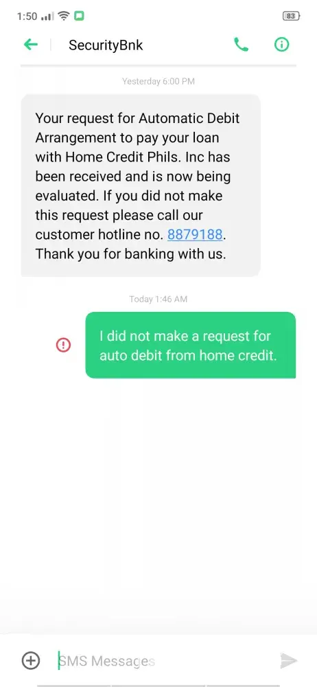 I did not make an agreement that i allow home credit to auto debit my payment on mu security bank account. How could i fix this. Should i go the the nearest bank or call you at the morning.