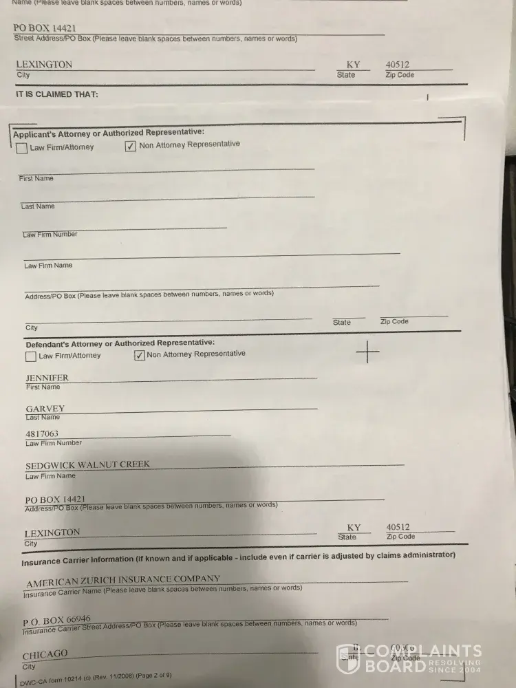 They always arrived on time every 2 weeks; while I attended physical therapy for my 513 knee injury; & after I attended physical therapy for my knee. From Sedgewick Walnut Creek in Lexington, Kentucky and American Zurich Insurance Company P.O. Box 66946 Chicago, Illinois 60606.Jennifer Garvey Claims Adjuster.