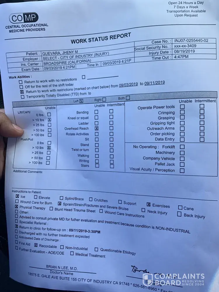 On August 19 I became having a burning pain in my back, I let a week pass by and the pain was severe . On August 26 I went to the office on 17700 Castleton st Unit 200 City Of Industry, CA 91748 United States . They send me to a doctors ! Which did nothing! Next thing you know I'm laid off work . Aug 28 they called me to go for modified duty to a non...