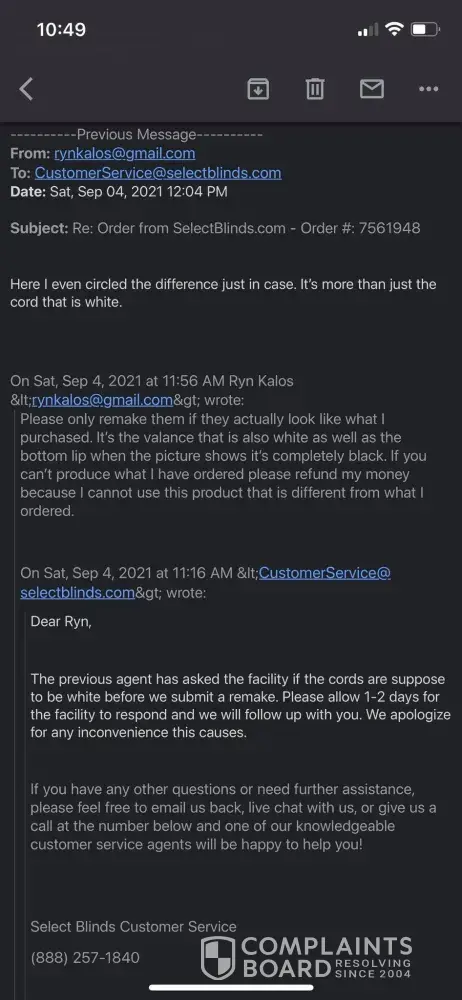 I have ordered from them before and was completely satisfied, so I didn't hesitate to order again. I ordered 2 black out cellular shades in Ivory for a bedroom. Ordering was easy and the blinds arrived 10 days later. We installed one, but when we went to install the other we discovered it was white!. I called customer service and that's where the nightmare began. I waited 20 minutes on hold and then was bumped to a voicemail. I went online and found "live chat" and tried that route. I got Amber Hale and she asked for pictures of the blinds. By the time I got the pictures and went to send to her email and return to the live chat screen I was kicked off for taking more than 4 minutes. I returned to live chat and all were off line. I wrote an email to the company. I tried live chat again and was asked for more pictures. I think I can tell the difference between white and ivory but she said they need to send to facility for review! I was insulted by the insinuation that I don't know color difference! She told me she would email me today, as yesterday was a holiday! Really, a private company in Arizona takes MLK day off? Today, you guessed it, no email. I called customer service, again on hold more than 10 minutes. Chatted on live chat with Karlie. She says it will be replaced, but they need to get the go ahead from the 'facility' and then they will email me. So that's where we stand. They have lost a customer.