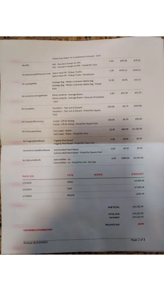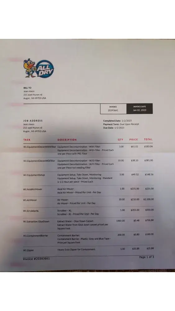 This was on Dec 27. They came back on the 28th and brought more fans. They were back on the 29th and removed the carpet from one small bedroom and again on the 30th and removed some insulation from the downstairs ceiling. They also moved the fans. They came again on the 31st and moved the fans again. Each time they came they were there was only for a brief visit.. not more than 1 to 3 hours. The 1st was a holiday and on the 2nd they came and removed the fans and gave us a bill of 13,357.52.
