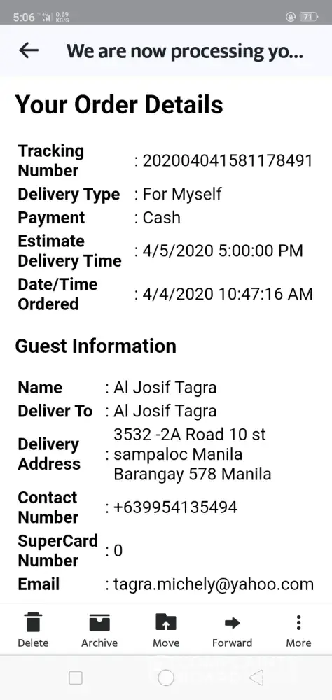 Last December 31, 2020, I made an order of pizza and chicken and also ordered a new supercard to be delivered to my other house house in 3b Psalms street, Camella Homes Classic, Pilar Village, Las Piñas The supercard never arrived. Please send me my card since I paid for it already. Please send it to either 699 Buffalo Street East Greenhills Subdivision Mandaluyong City or to 3b Psalms street, Camella Homes Classic, Pilar Village, Las Piñas. Please confirm that you received my request.