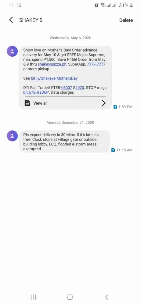 I callled shakeys delivery hotline and operator was a lady. At first, i asked my son to call that time when i heard they started talking, i picked it for me to discuss our orders. During our conversation, she repeatedly asked me due to my voice was due to low volume based on her comment. Then i asked her if i can use my eGift but sadly need minimum of 2 eGift codes, then next was the supercard, however it expired then next was my voucher. When i gave my serial number, she told me to wait for 1 to 2mins but already past 5mins without any update or courtesy just to inform me to wait longer. So i just dropped the call. It only shows Poor service.