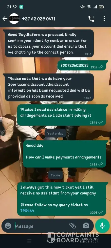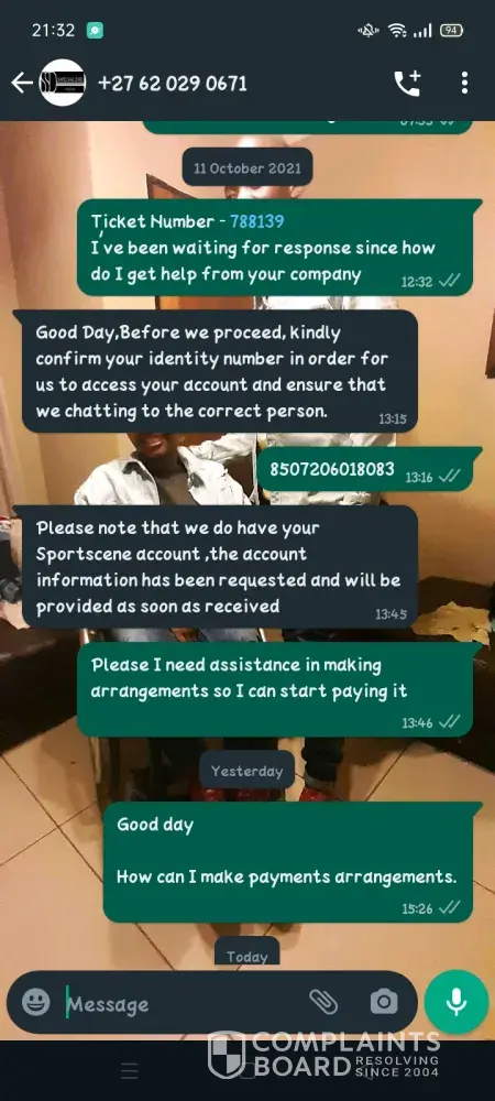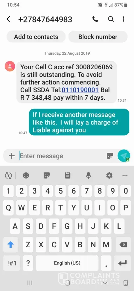 I has received numerous request from their Agents claiming that I owe them money. They claim to be acting on behalf of MTN, but don't seem to have access to MTN records. I have explained to them that my account was in dispute, MTN refused to listen to me concerning overcharging, I refered the matter to ICASA. I was during this time that these guys bought this debt from MTN. I later had an agreement with MTN (settlement), and my account was activated. I have explained to these guys that my account was active @ MTN, and not in arrears as they claim. The amount that they are harassing me for, is the amount that is charged should someone cancelled a contract. I never cancelled any contract with MTN, and now I don't know what these guys are referring to. I have sent them emails, explaining this issue, gave them contacts of a person at MTN, who they should contact and verify my statements. They simple pretend as if they are not aware of this fact (unethical), and send a lots of messages which reads " iminent legal action" or "urgent payment required" or just keep sending bank details where to pay or speed point details or any other form of verbal/ written abuse. They also harass me with phone calls everey day, they keep trying to scare me into paying for this fraudulent claim. They are very rude on the phone, and you must do what they want or else ... I have sopken to the following individuals by at SSDA: Allison Goordeen ( talked on the phone and I sent her information concerning all my statement), Aubrey ( phone conversation and emails), important to note, as soon as i mentioned Allison's name Aubrey didn't want to talk anymore, could not wait to end the chat. The other rude individuals who called me and threatened me are Zamokuhle & Katlekgo, the did't want to discuss anything unless I agree to do what they wanted. they dropped the phone and then sent me a lot of sms's. Consult Allison concerning any documents and emails