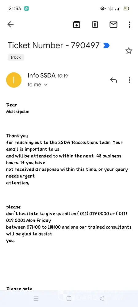I have been receiving the agents from ssda and everytime I tell them to stop calling me this account is prescribed and I am not gonna pay it. An agent bu the name of Serame called me and he was very rude. I raised a concern with Tshepo whom told me he is the manager in the department however he himself did nothing about the issue because even after telling him my concerns