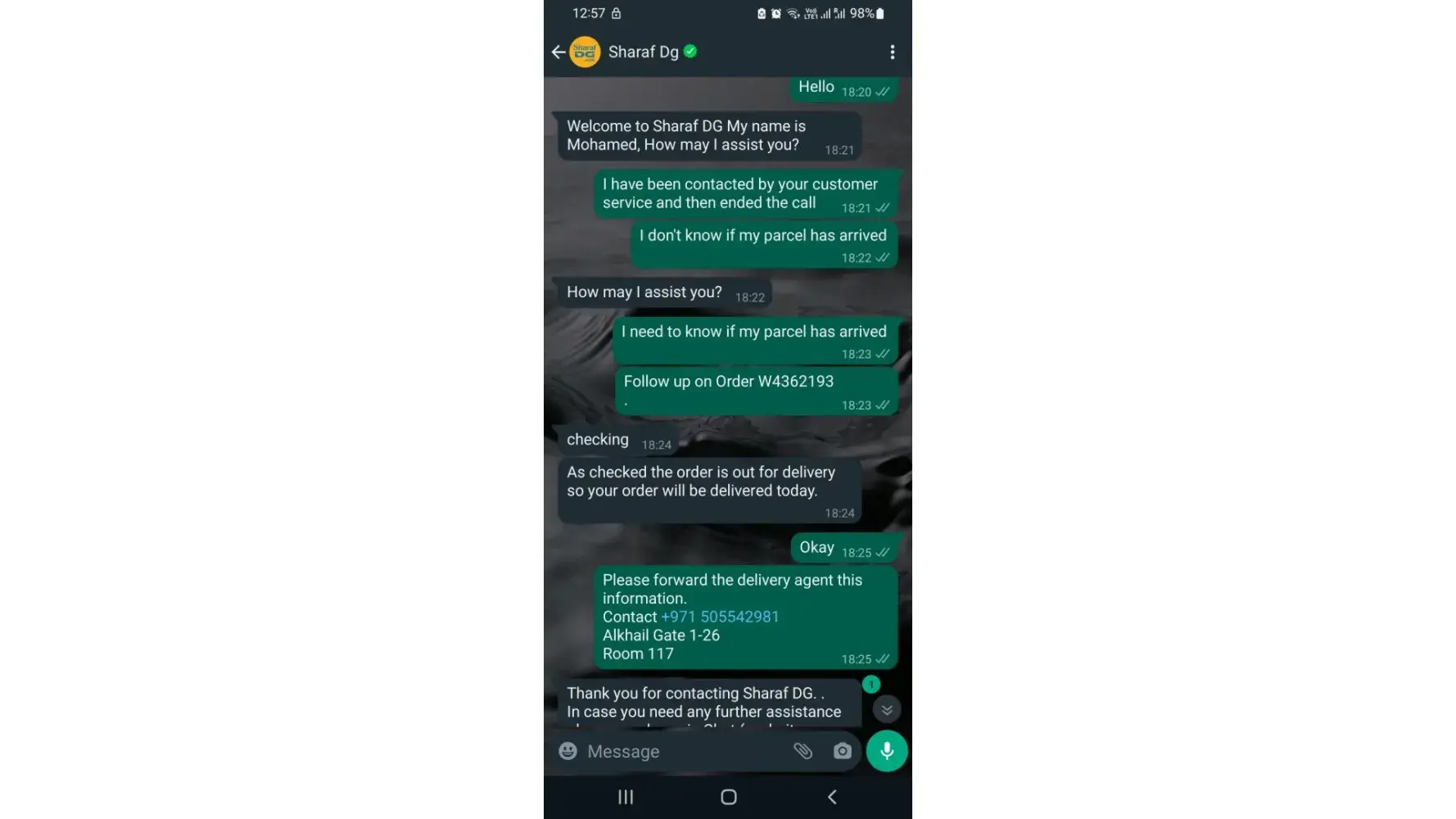 I am very disappointed in the lack of service provided by Sharaf DG with delivering the gas job Ref: SIDM101040923272 bought on Monday 4th Sept 2023 in Dubai Mall. I have attached the receipt of the purchase. I have been lied too about being called to confirm delivery.
