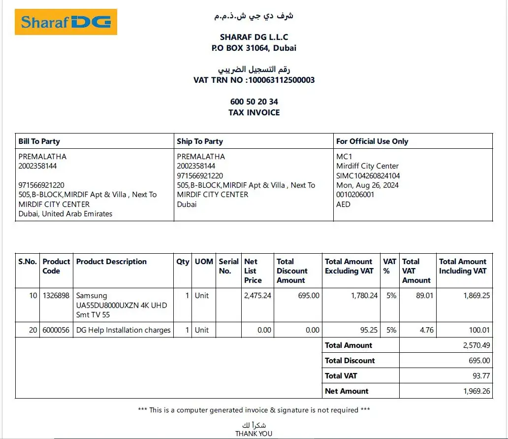 I purchased a SAMSUNG television on August 26, 2024 from Sharaf DG at Mirdif City Center under an exchange offer. According to the offer, the new TV would be installed, my old TV would be collected, and a credit would be issued to my account. My old TV 65 inches-HISENSE had also been originally bought from Sharaf DG. When the team came to install the new TV, they collected my old one, assuring me that I would receive a payment after submitting my bank details through a link in an upcoming email. However, I never received any such email or communication. After following up with Sharaf DG today, I was informed that no payment would be made for my old TV.