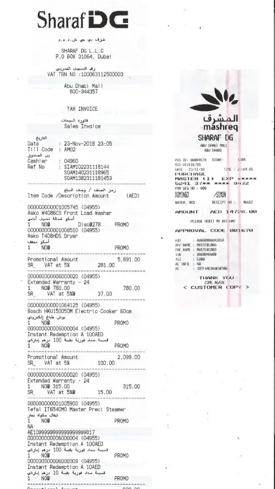 Part of my purchase is a bundled unit of ASKO Washing Machine and ASKO dryer which costed together at AED 5, 891 + VAT. Since this is an expensive item, I clearly asked to have both units to have an additional 2 years extended warranty. Together with the other big value items that I also asked for extended warranty.