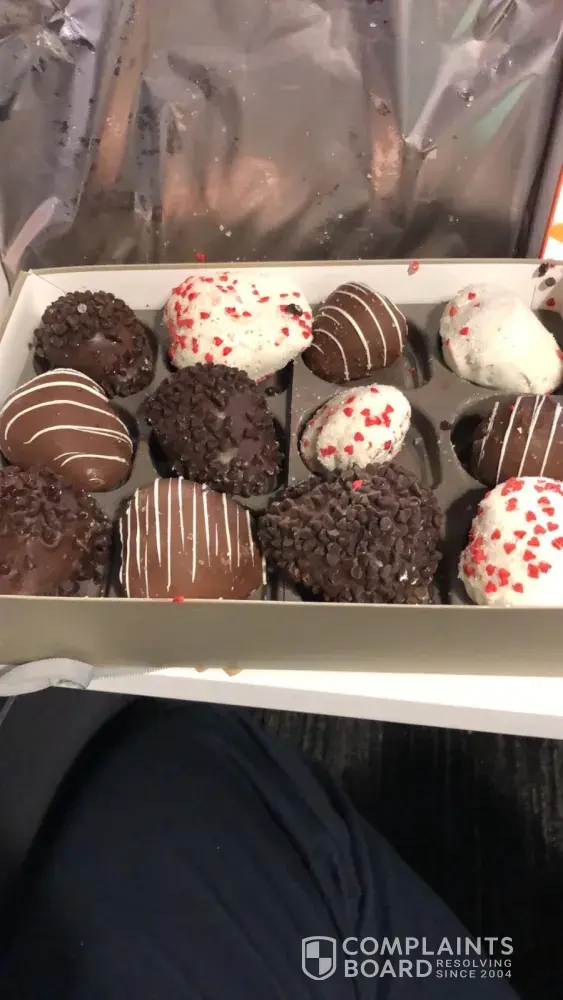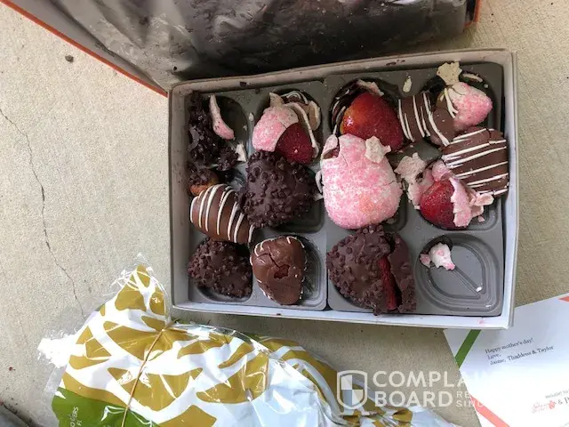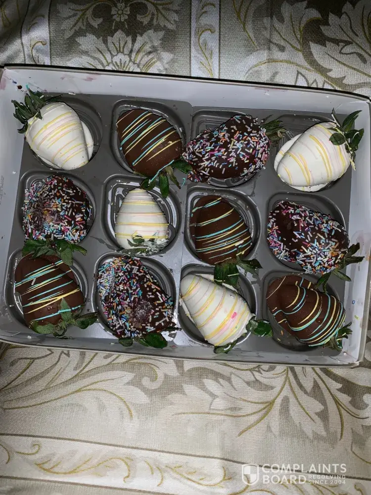 They were on the UPS truck all day and the attached picture shows what they look like. Not as bad as others but it was a gift for my 89 year old grandmother who loves chocolate covered strawberries. I don't think I will order from Shari's berries again. I haven't called them yet to let them know. Why should I have to pay even more money to get them delivered in the A.M. They need to do something about there delivery process. They may leave there facility looking good but UPS doesn't care.