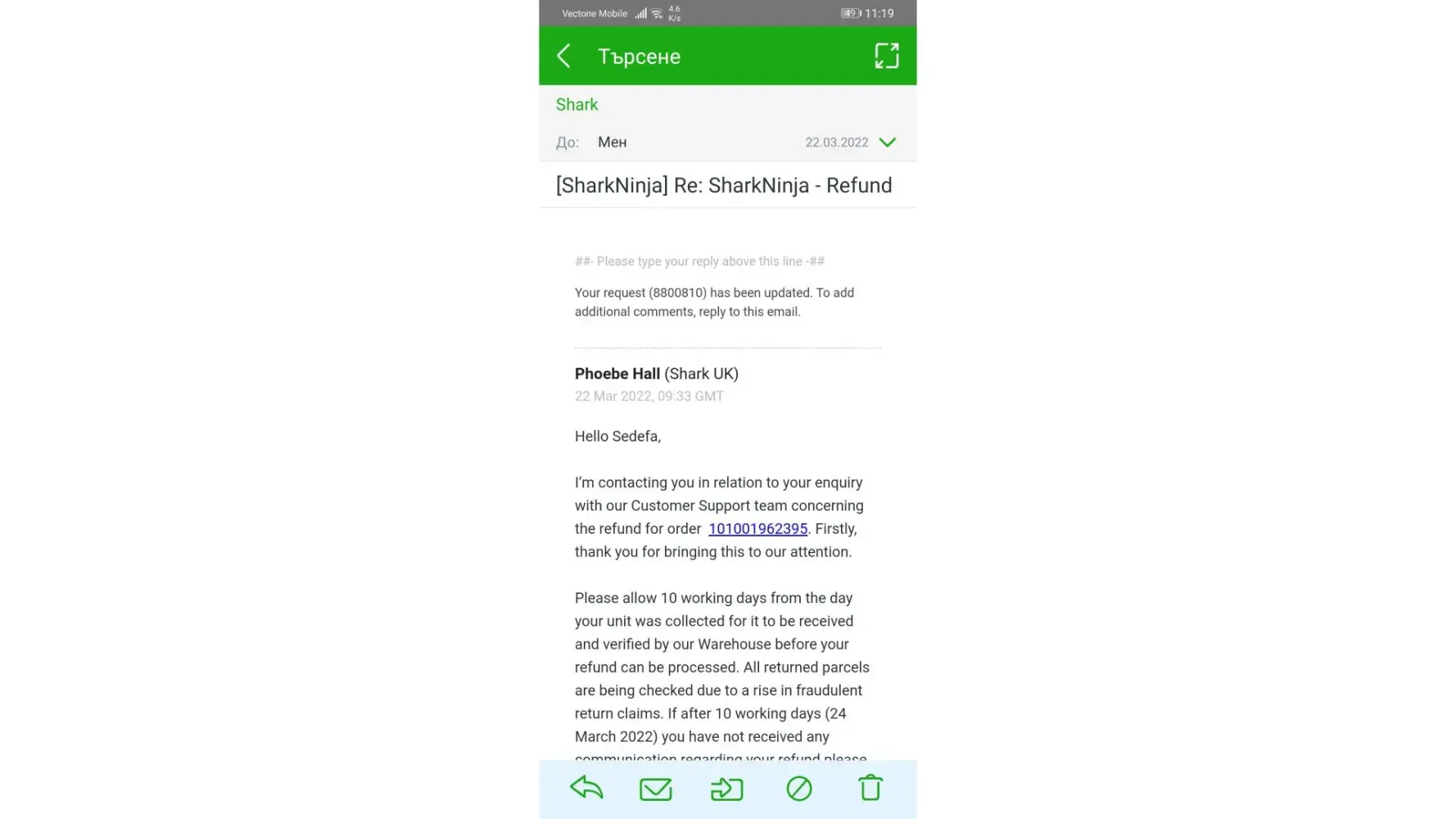 Returned the vacuum which was delivered to them on March 9th, 2022 (shows delivered), called them after 1 week, and Shark customer service confirmed the receipt of the vacuum and said the refund will be issued within 10 days. It's been over 3 weeks since the last call to them and they have still not issued the refund.